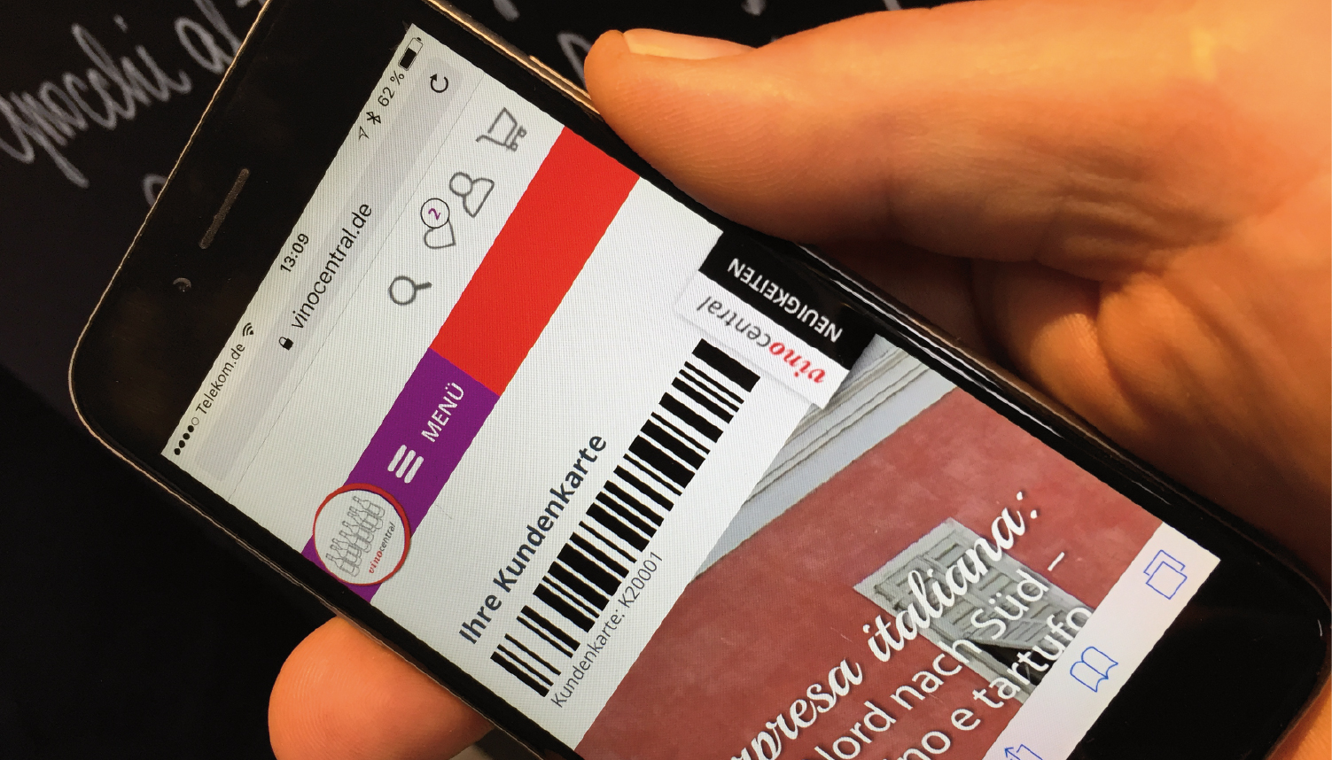 Die mobile vinocentral-Webseite funktioniert noch besser als eine moderne App. Wenn man sich darauf mit seinen Kundendaten anmeldet, erscheint automatisch die eigene Kundenkarte mit dem nötigen Strichcode. Dieser Code kann dann an allen Kassen und Ausgaben innerhalb des Ladengeschäfts gescannt werden.