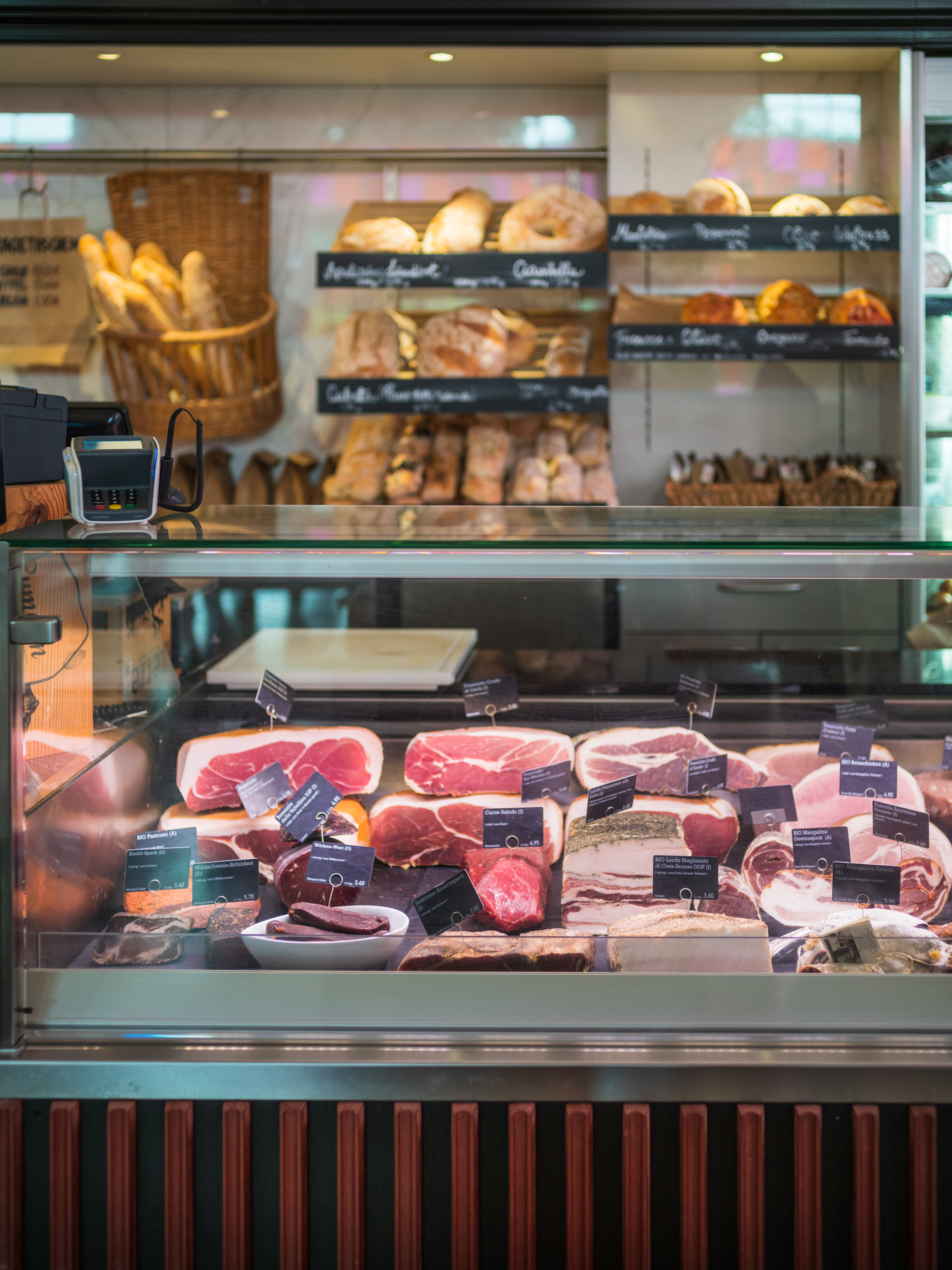 Schwerpunkt unseres Frischtheken-Sortiments ist eindeutig Italien, aber es gibt auch französischen „Fromage“, Bio-Käse aus der Oberpfalz, die Schweizer Käseinnovationen von Jumi oder Wiener Bio-Beinschinken vom Mangalitza-Schwein. Alles wird erst bei Bedarf aufgeschnitten, am liebsten hauchdünn. Denn noch etwas eint das gesamte Angebot: Jeder Schinken, jeder Käse verspricht bereits pur und in feinster Zartheit höchsten Genuss.