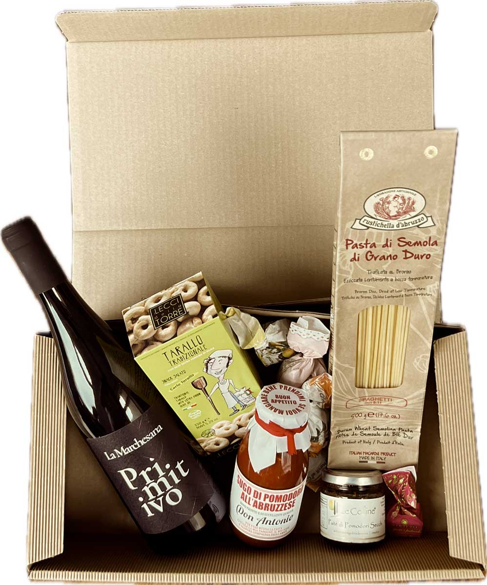 Präsent mit einer Flasche Primitivo & anderen italienischen Köstlichkeiten.
