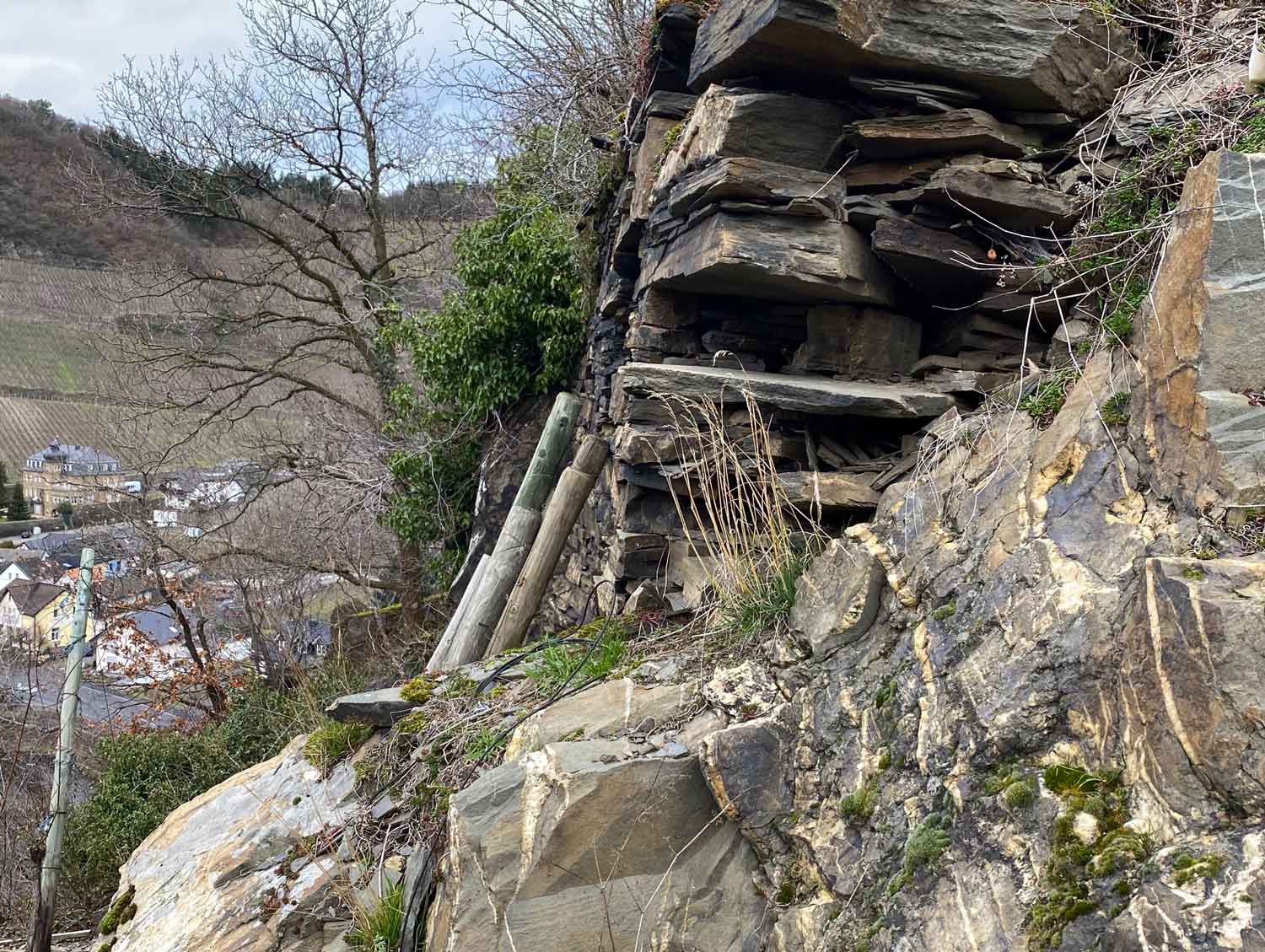 Da der Berg von oben nach unten verwittert, sind die Böden weiter oben am Dernauer Hardtberg deutlich magerer als im darunter liegenden Pfarrwingert. Doch das ist kein Problem, im Gegenteil: „Die Rebe soll kämpfen, das tut ihr gut“, erklärt Benedikt. „Die Weinstöcke müssen in Konkurrenz sein und sich durchsetzen, wie in der freien Natur. Das macht die Trauben sehnig, den pH-Wert niedrig – und die Weine lagerfähig.“