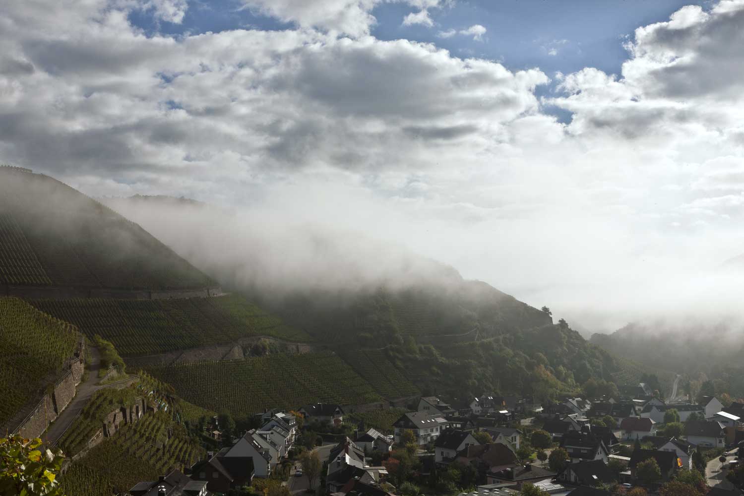 Auf der nur 561 Hektar großen Rebfläche des Ahr-Tals gibt es im wesentlichen zwei Bodentypen. Der westliche Teil wird von steilen, dunklen Schieferhängen dominiert. Die Landschaft wirkt spektakulär, jeder noch so kleine Winkel ist terrassiert. Kalte Luftströme aus der Eifel sorgen für starke Temperaturunterschiede zwischen Tag und Nacht.
