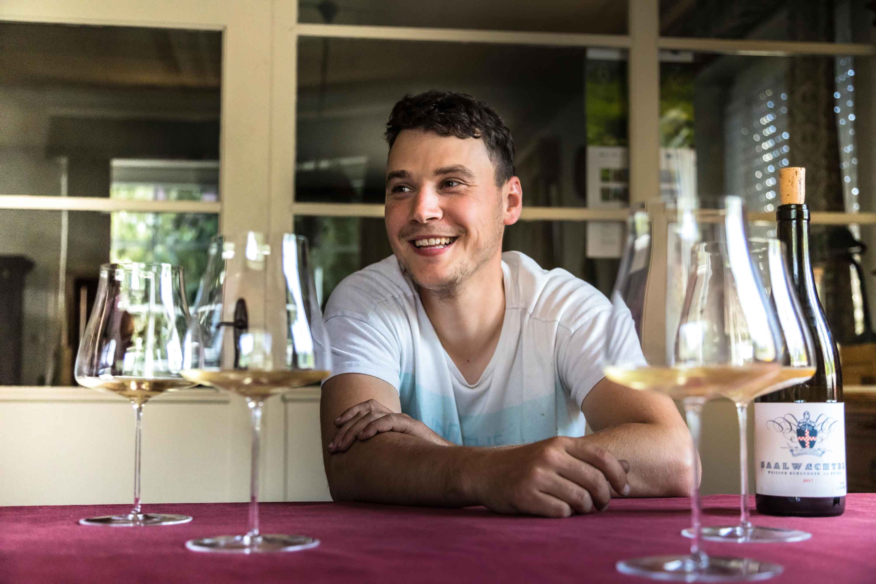 Anders als viele Winzer*innen der jungen Generation ist Carsten Saalwächter kein Geisenheim-Absolvent, sondern hat das Handwerk in Weinberg und Keller gelernt. Zehn Jahre lang arbeitete er auf Weingütern, die in Sachen Burgunder-Sorten Rang und Namen haben: Jean Stodden, Schnaitmann, Benedikt Baltes, Chat Sauvage, Friedrich Becker, Domaine des Lambrays, Jean Chartron und Hanspeter Ziereisen. Letzter hat ihn vermutlich am meisten beeinflusst. Aber auch der angehende Winzer hinterließ Eindruck: Ziereisen spricht gerne vom „besten Praktikanten, den er je hatte“.