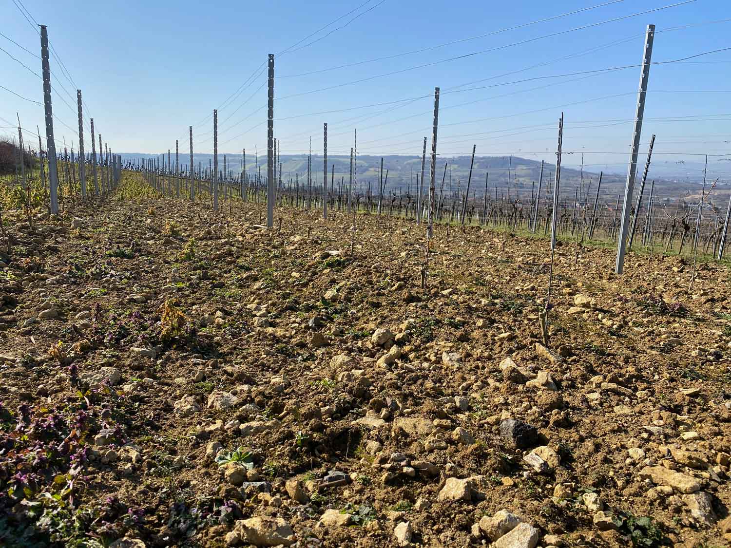 Die Rebflächen auf dem Hochplateau in Ingelheim hingegen sind vom Muschelkalk dominiert. Da die Gemarkung von der Flurbereinigung verschont geblieben ist, gibt es eine Vielzahl an Einzellagen, keine größer als drei Hektar, die mit alten Reben bestockt sind und jeweils ein anderes Mikroklima aufweisen.