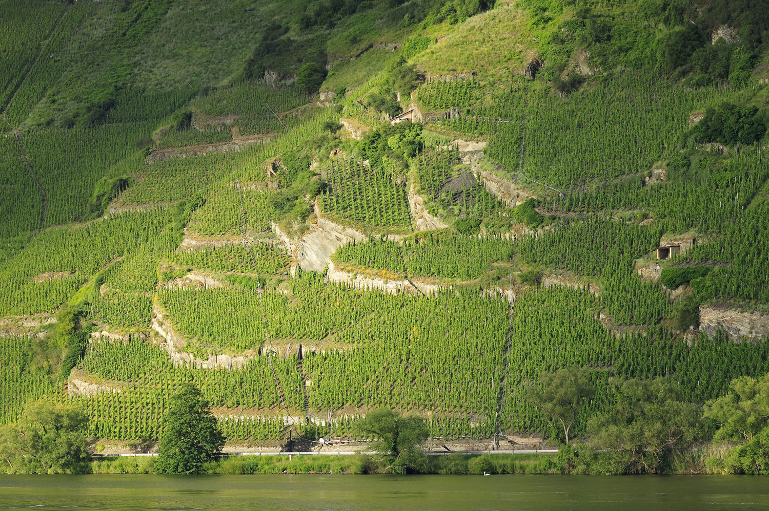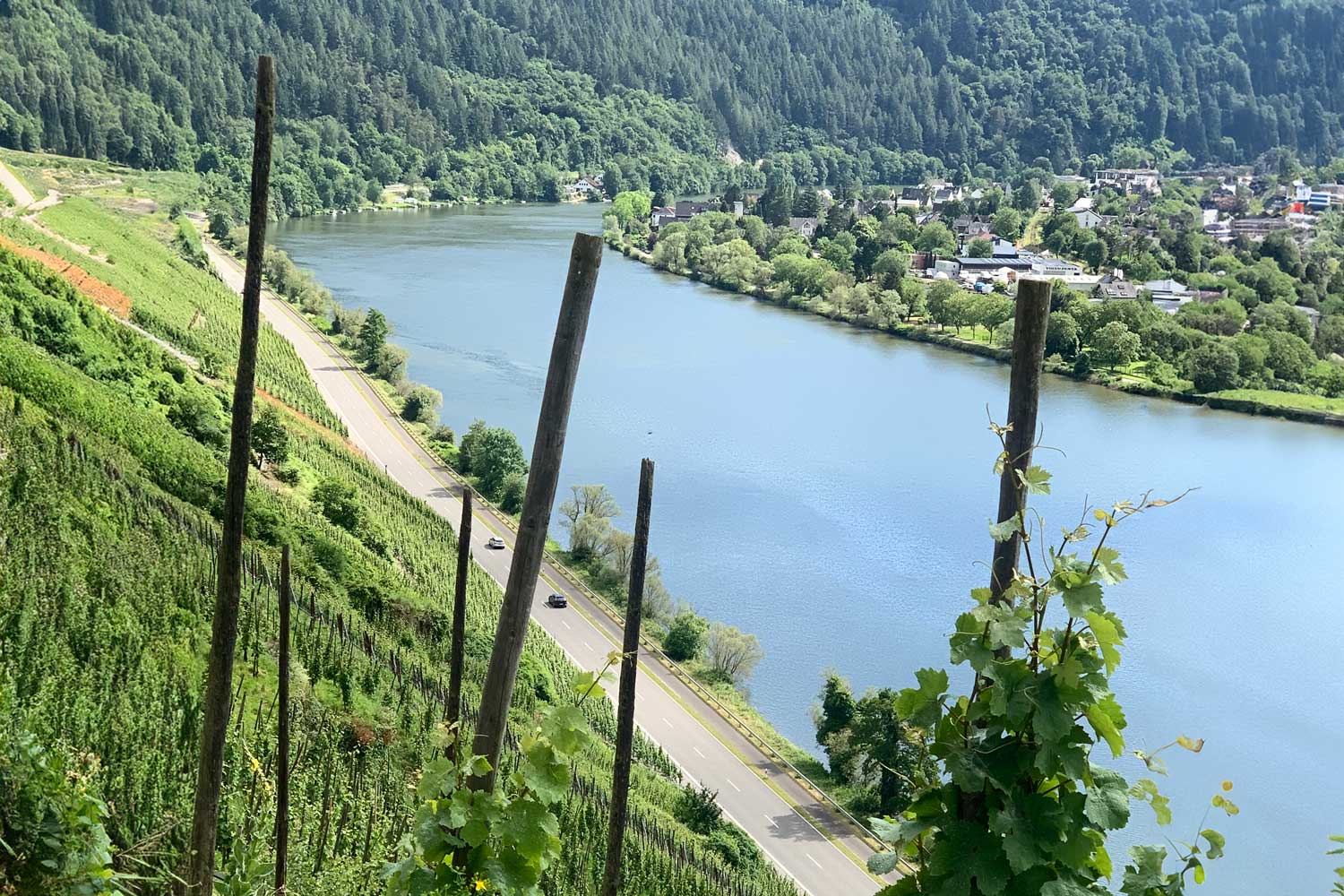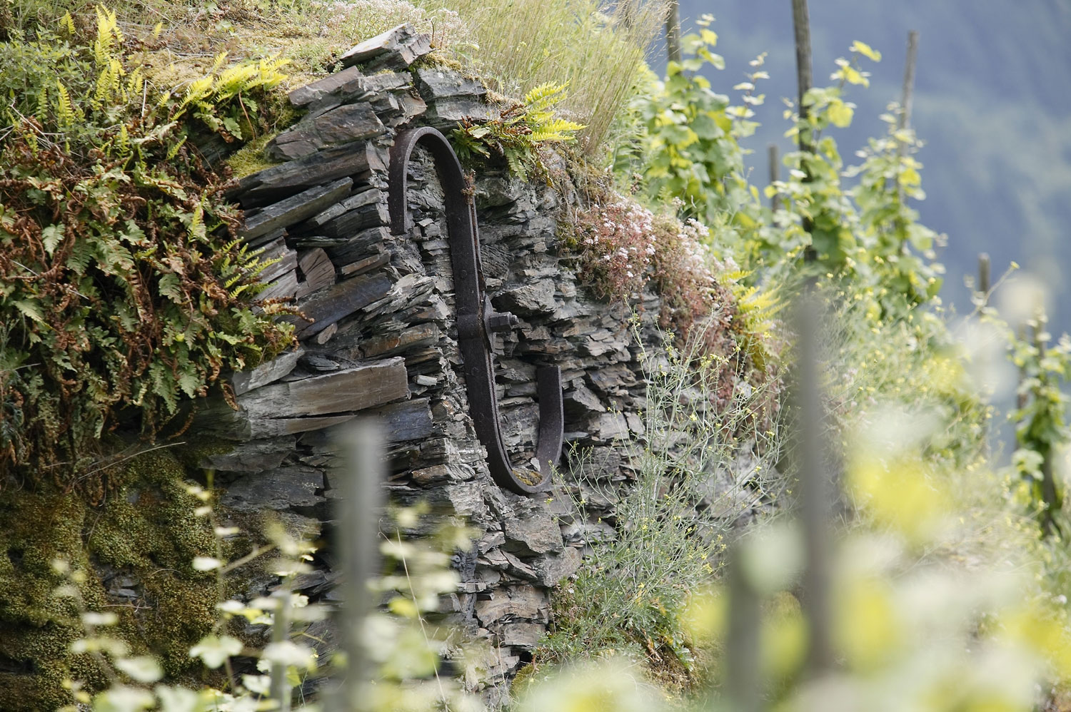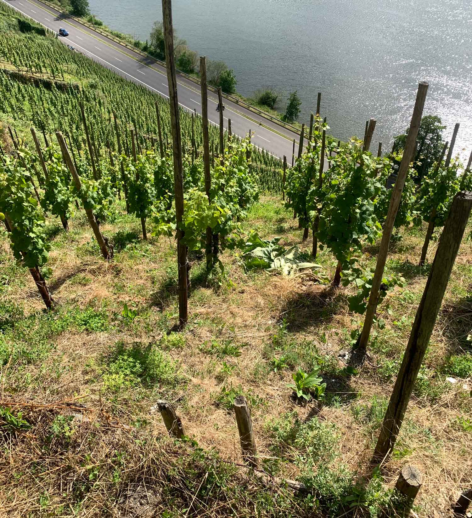 Der Blick der Enkircher Ellergrub auf die malerisch durchs Tal mäandernde Mosel ist in jedem Sinn des Wortes ein erhabener. Selbst wenn man etwas außer Puste auf leicht zittrigen Beinen steht. Denn man muss die rund 280 Höhenmeter auf den teils schwindelerregenden Schiefertreppchen mal selbst hinaufgestiegen sein, um ahnen zu können, was Weinbau an einem so extrem steilen Hang bedeutet. Noch dazu in seiner sehr viel aufwendigeren ökologischen Variante. Das „Monorack“, eine kleine motorisierte Einspurbahn, nimmt den Winzer*innen zumindest den Transport schwerer Lasten ab. Rebschnitt und -pflege, Pflanzenschutz, Lese etc. bleiben jedoch Handarbeit. Kein Zuckerschlecken bei bis zu 65 % Hangneigung. Da wird einem klar, wie viel Leidenschaft Alexandra Künstler und Konstantin Weiser antreiben muss und wie viel Kraft und Ausdauer es wohl kosten mag, dem Schieferberg hier Jahr für Jahr Rieslinge abzuringen, die dann so unangestrengt und geradezu schwerelos über den Gaumen fließen, dass von all den Mühen ihres Entstehens nichts zu spüren ist. Und genau hier in der steilen Ellergrub – wo andere aufgegeben hatten – hat ihr eigenes Weingut Weiser-Künstler seinen Anfang genommen.