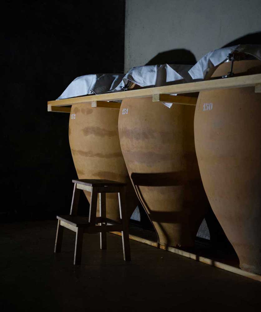 Mittlerweile reift ein Drittel ihres Weins in 400-Liter-fassenden Amphoren. Er gärt auf der Maische allein mit Hilfe der natürlich vorkommenden Hefen. Der Ausschluss von direktem Luftkontakt schützt ihn vor schneller Oxidation, gleichzeitig lässt das Tongefäß zu, dass er ausreichend atmen kann. Der Wein muss nicht filtriert werden, die Schwebeteilchen setzen sich ganz von selbst auf dem Boden der Amphore ab.